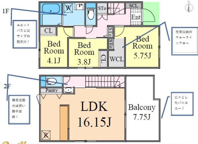 (1F)洋5.75、洋4.1、洋3.8+WIC、(2F)LDK16.15 |